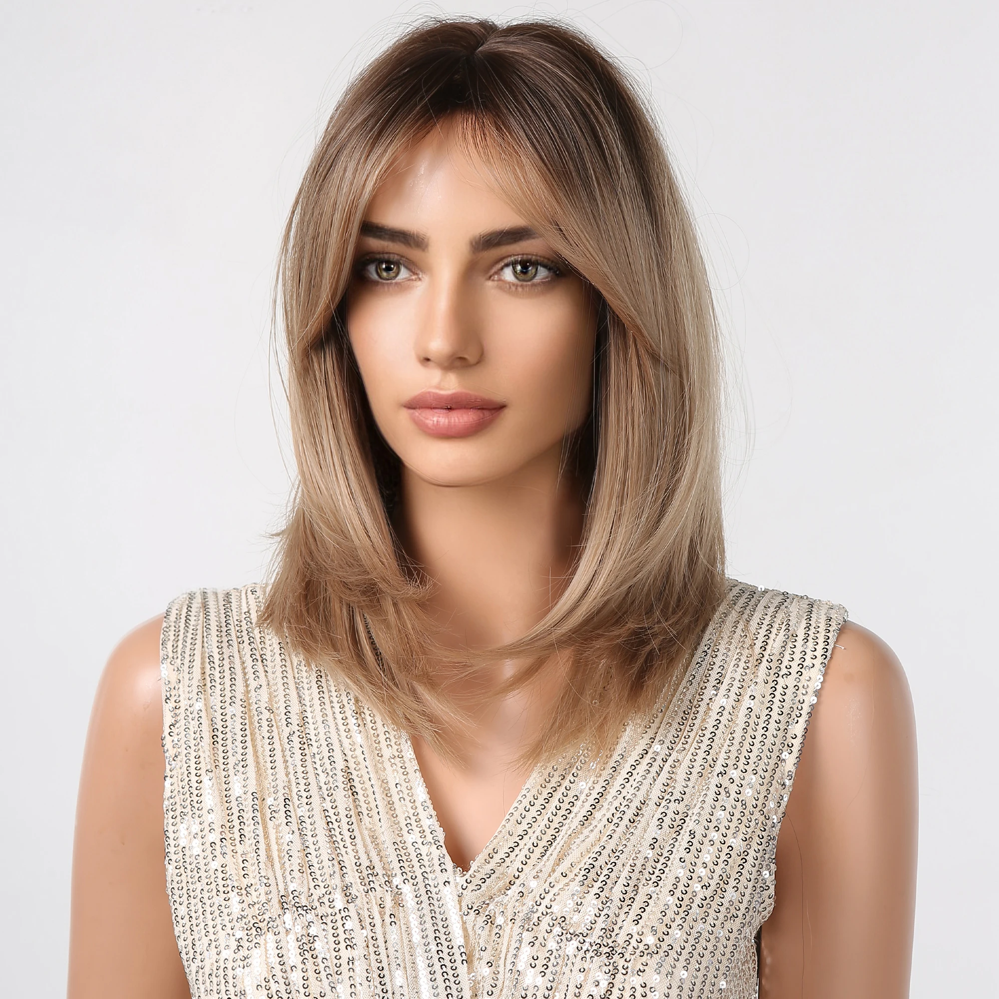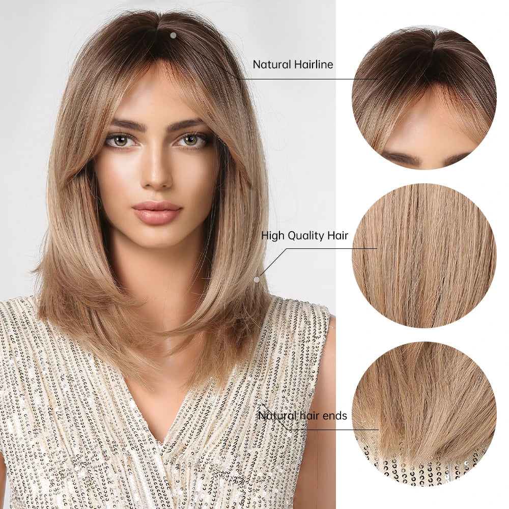 Short Layered Synthetic Wig Ombre Brown Medium Length Straight Natural Looking Hair Wig with Bangs Heat Resistant for Women Afro