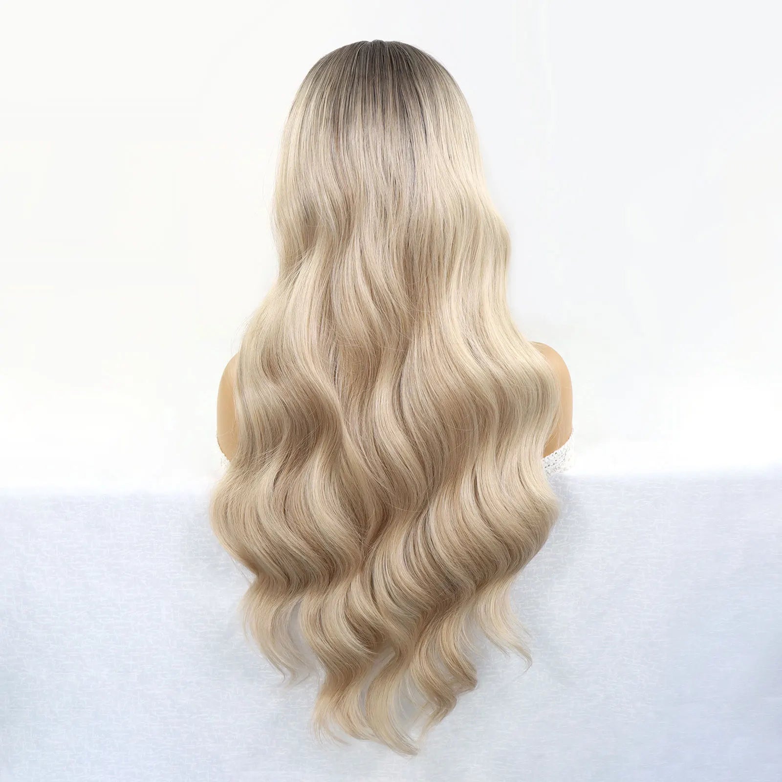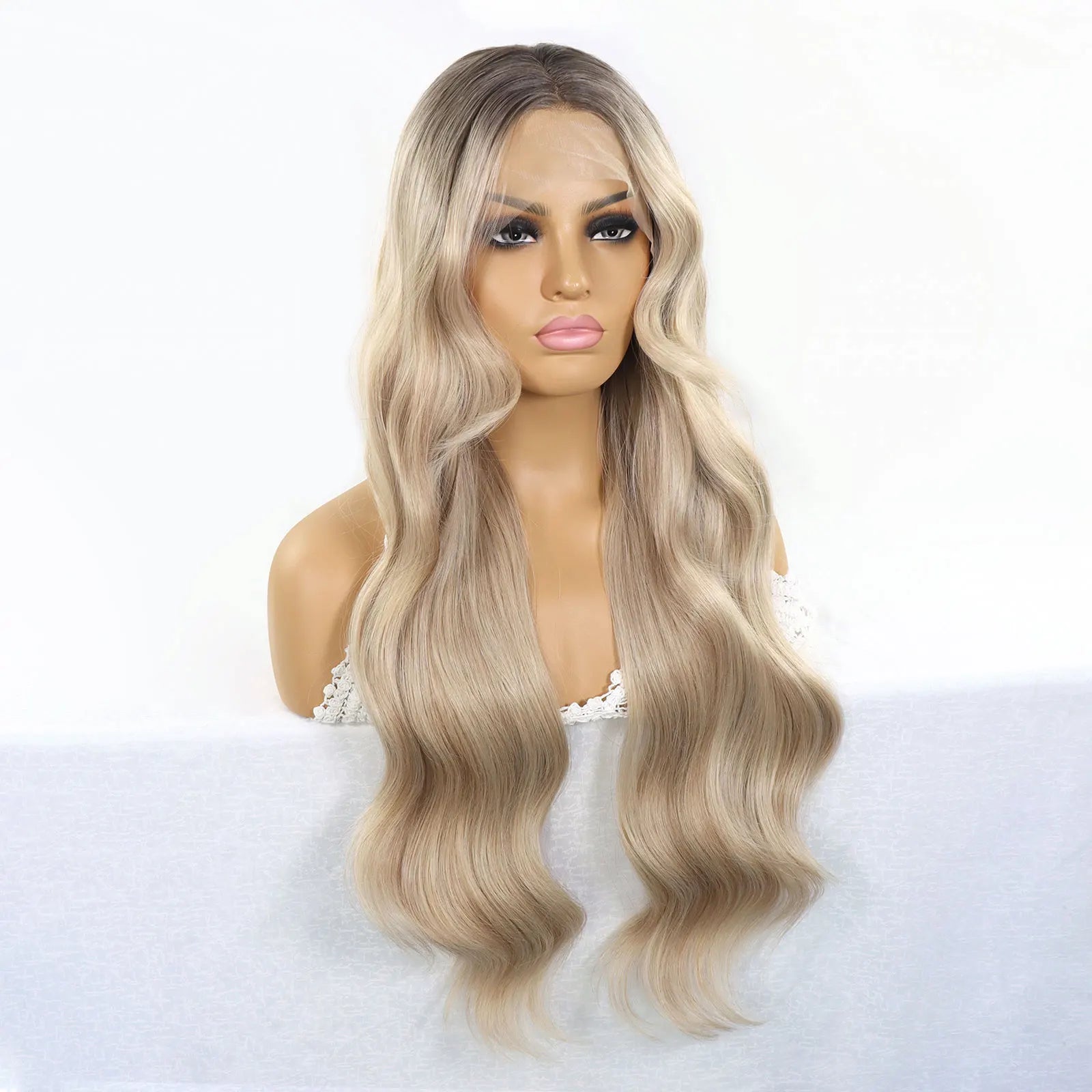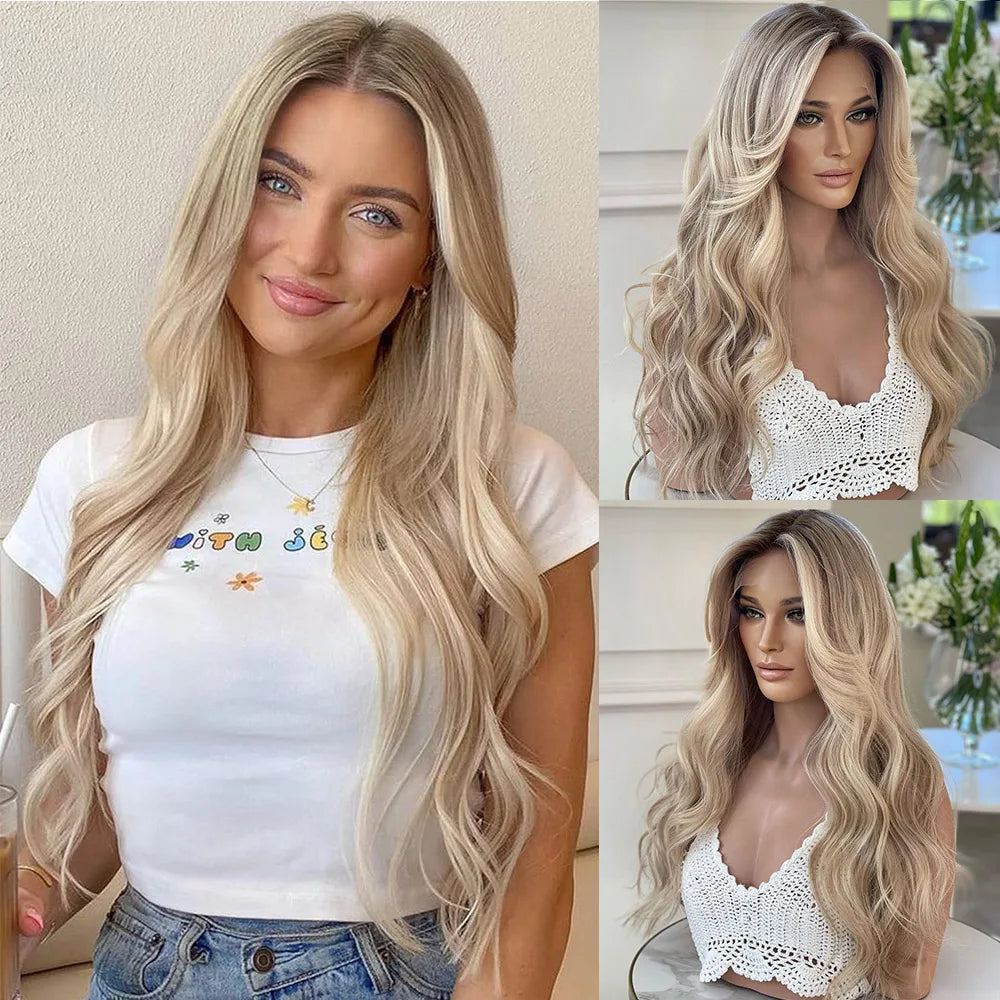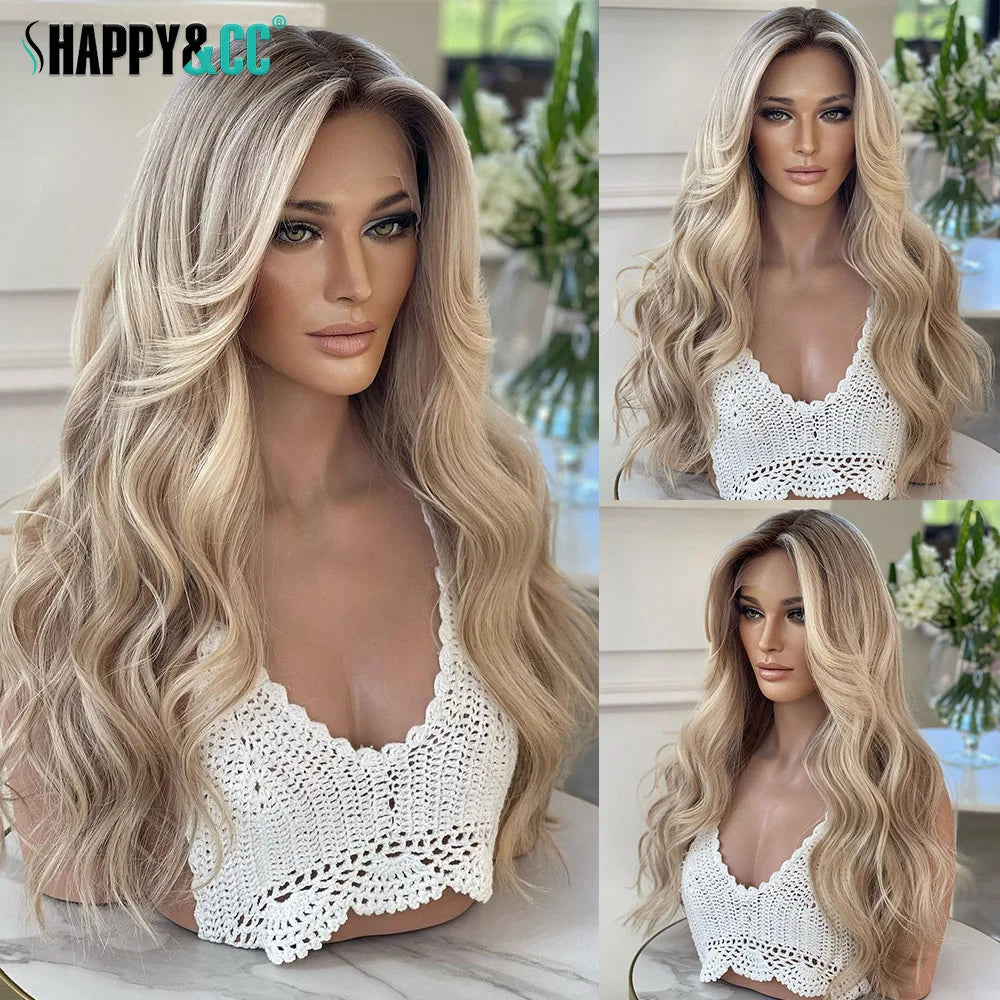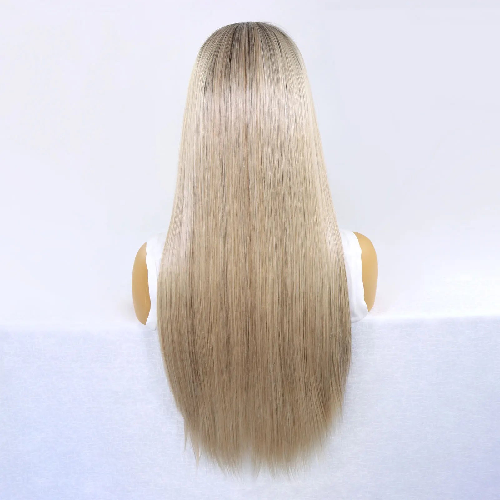 30 Inch Highlight Blonde Synthetic Lace Front Wigs Dark Roots Straight Long Ombre Ash Blonde Pre Plucked Colored Wigs for Women