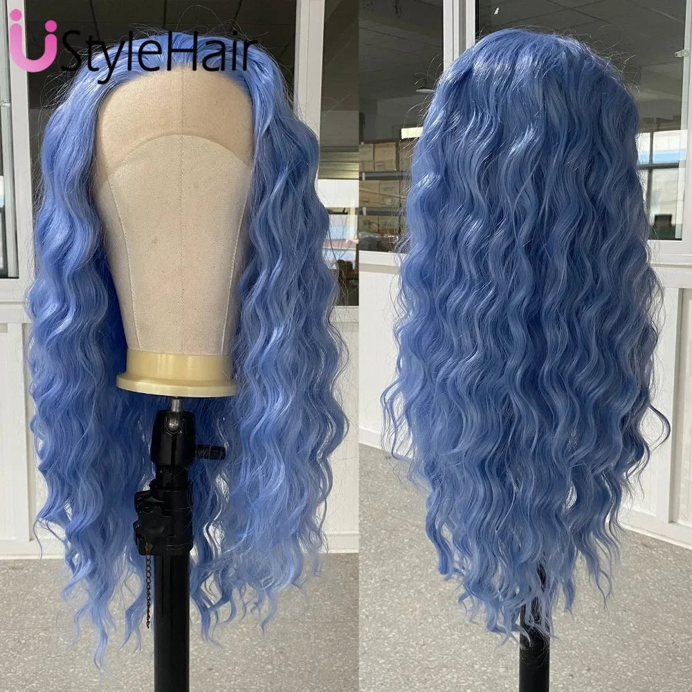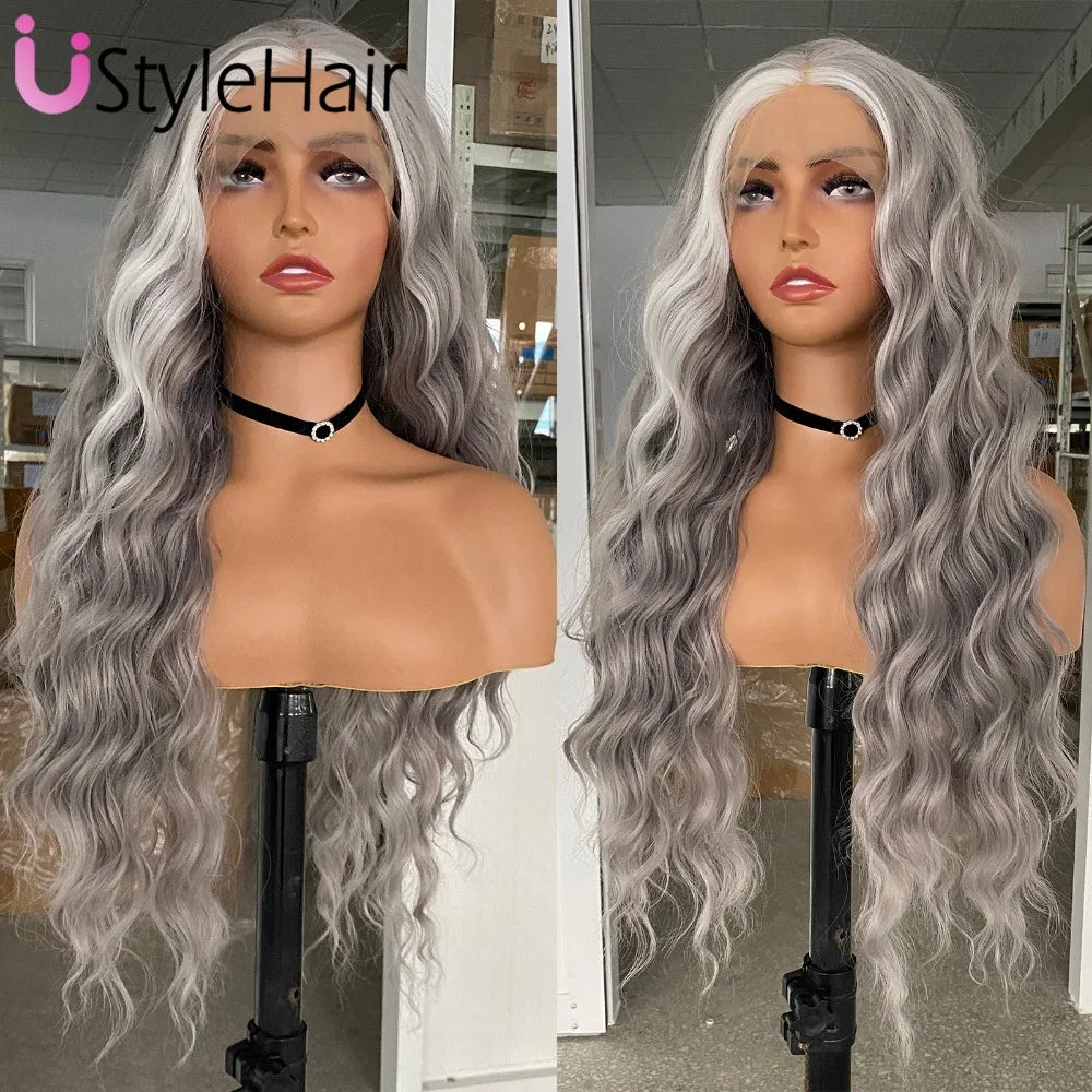 Silver Wig with White Highlights Synthetic Long Deep Wave Lace Front Wig Natural Looking Daily Use Cosplay Light Grey Lace Wigs