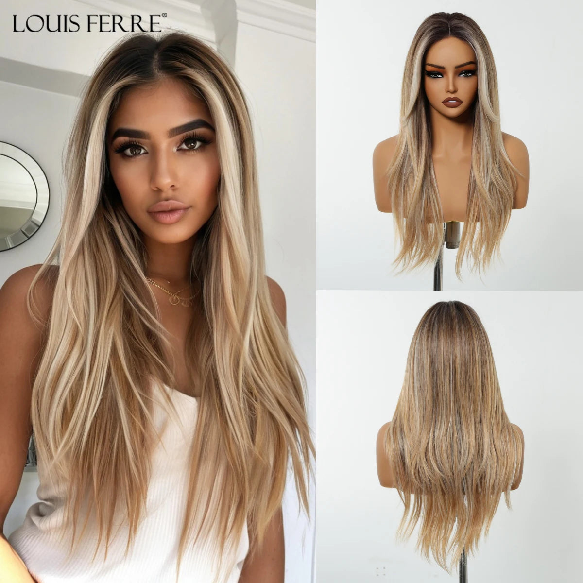Long Straight Hairline Lace Front Synthetic Wig For Black Women Brown Mixed White Natural Middle Part Wig For Daily Cosplay